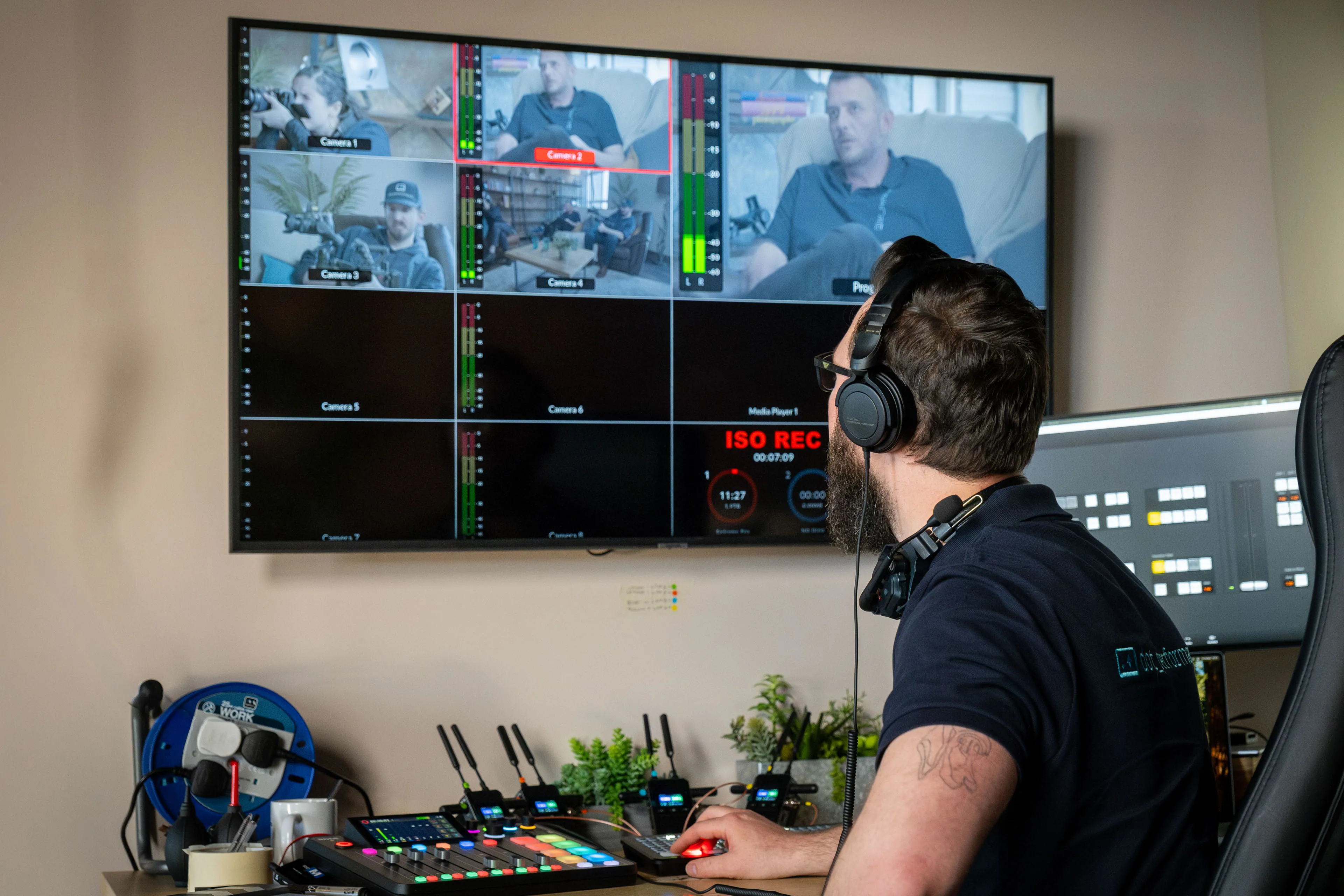 Our podcast and interview studio runs up to eight cameras through a Blackmagic ATEM Mini Extreme ISO, all feeding back to a control centre where every angle is visible live on screen.